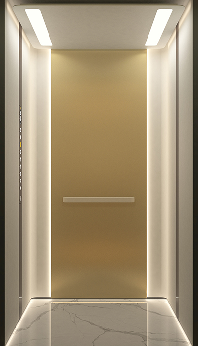 轿壁:香槟金发纹化妆钢板、雅白布纹化妆钢板、灯带、烤漆玻璃触摸COP