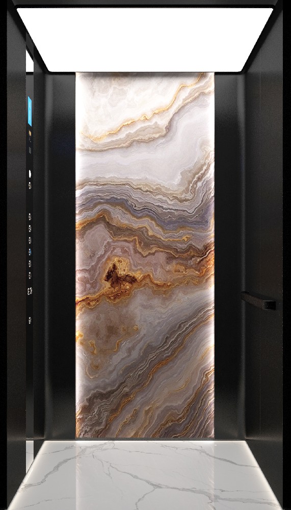 轿壁:黑钛拉丝化妆钢板、岩板、灯带、镜面不锈钢整体式COP